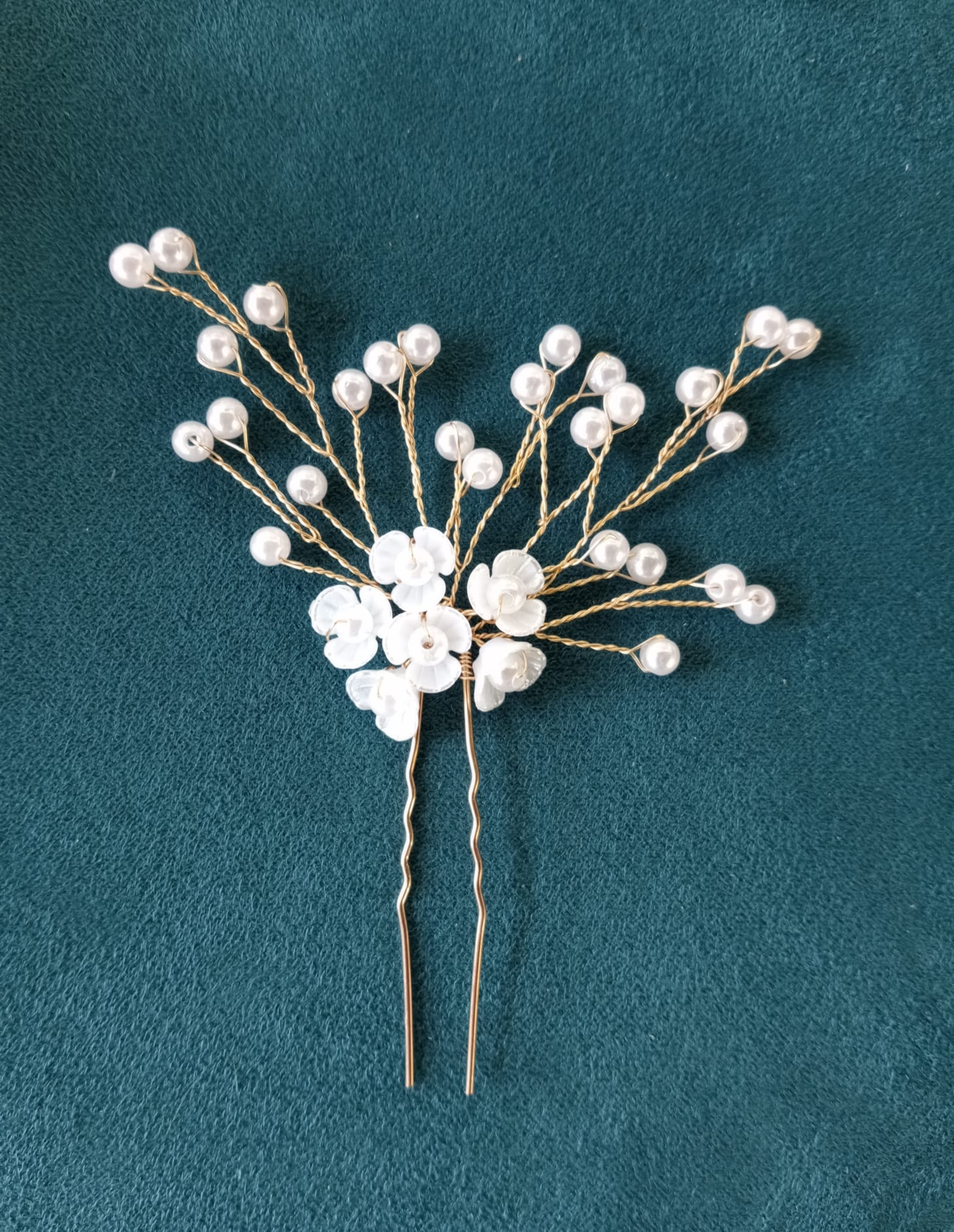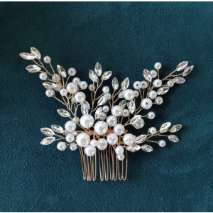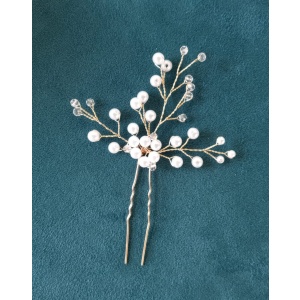 Horquilla en tono dorado y aspecto floral, está decorada con relucientes perlas de imitación blancas. Preciosa horquilla que destaca por su forma floral y perlas brillantes.
